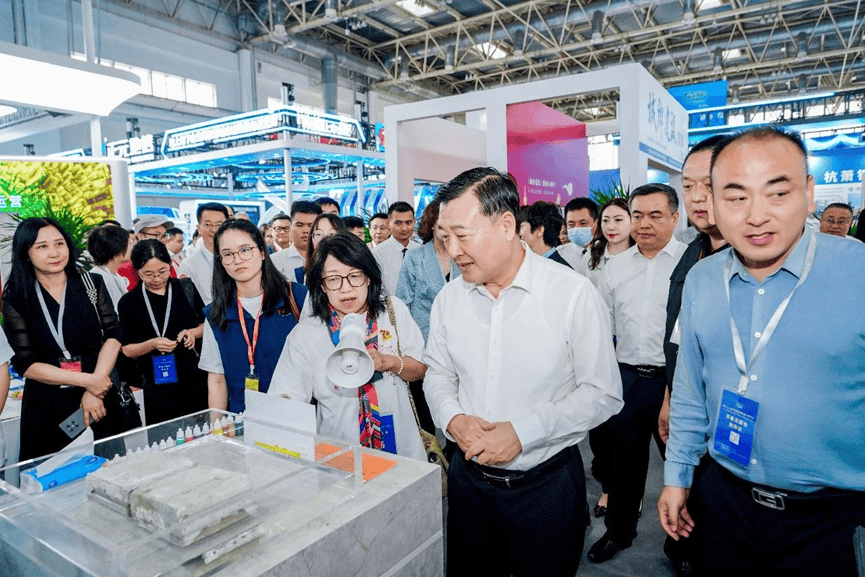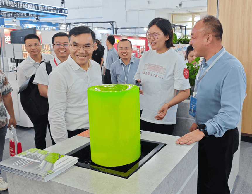 姜萬榮副部長參觀澎內(nèi)傳展臺,邊聽講解、邊認真觀看水池池壁裂縫自愈合實際應(yīng)用效果。